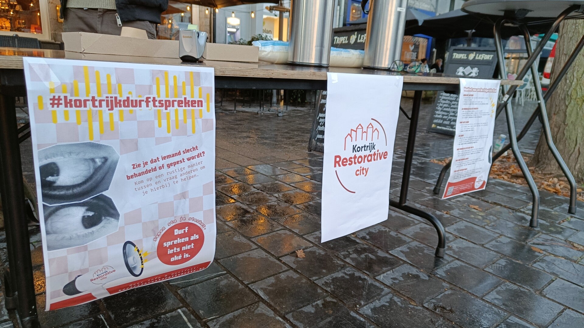 Op maandag 17 november trokken we met Kortrijk Restorative City de Kortrijkse maandagmarkt op, gewapend met één eenvoudige maar krachtige vraag: “Durf jij spreken als iets niet ok is?”